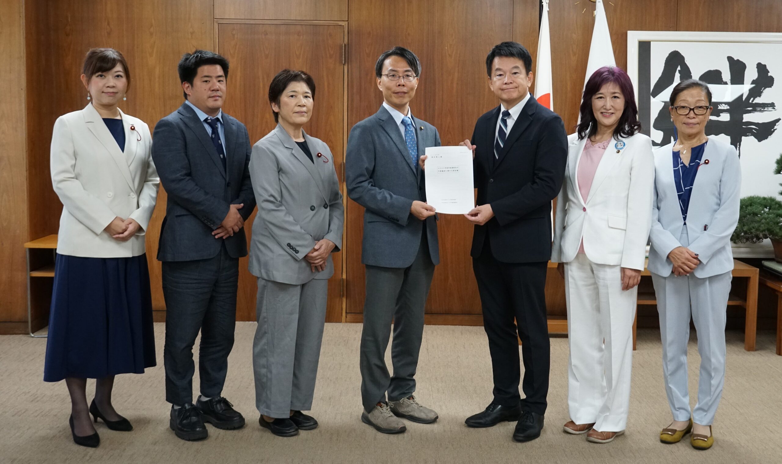 10月1日、党市議団は清水勇人市長に対し、2026年度に向けた予算要望を提出しました。全部で520項目です。重点テーマとして物価高騰対策、気候変動対策およびジェンダー平等実現のための対策を特出しで要望。物価高騰対策として、すべての市民を対象にした水道料金の引き下げをおこなうこと、市内小規模企業者等へ支援金を支給すること、肥料・資材高騰に対応した農業者への営農支援の補助を行うこと、そして小中学校および市立特別支援学校の給食費を無償にすることを求めました。